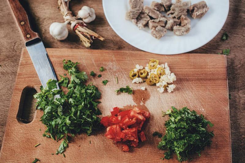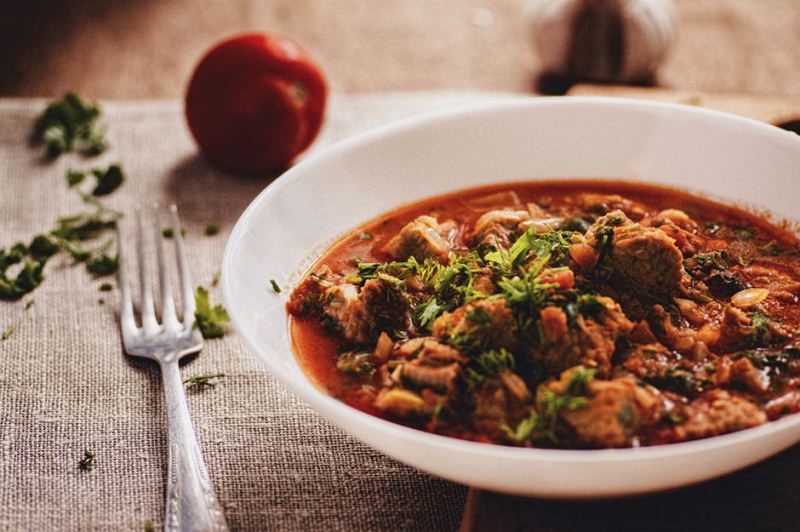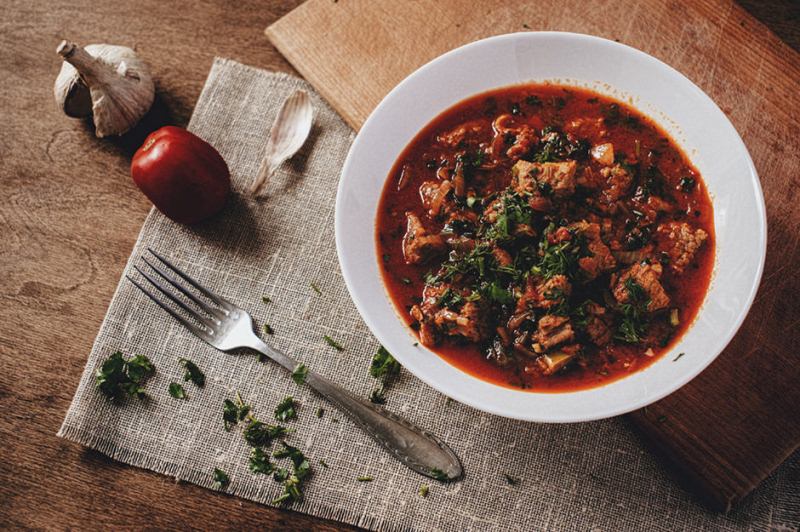 Рецепт несложный. Мясо (около килограмма говядины) режем небольшими кусочками и тушим на постном (можно с добавлением сливочного) масле вместе с луком (примерно две луковицы). Когда говядина даст сок, добавляем томатную пасту и болгарский перец. Затем черед очищенных от кожицы и порезанных на средней величины кусочки помидоров. За 5-10 минут до готовности блюда в ход идут специи – кинза и петрушка, а также пропущенный через давилку чеснок.