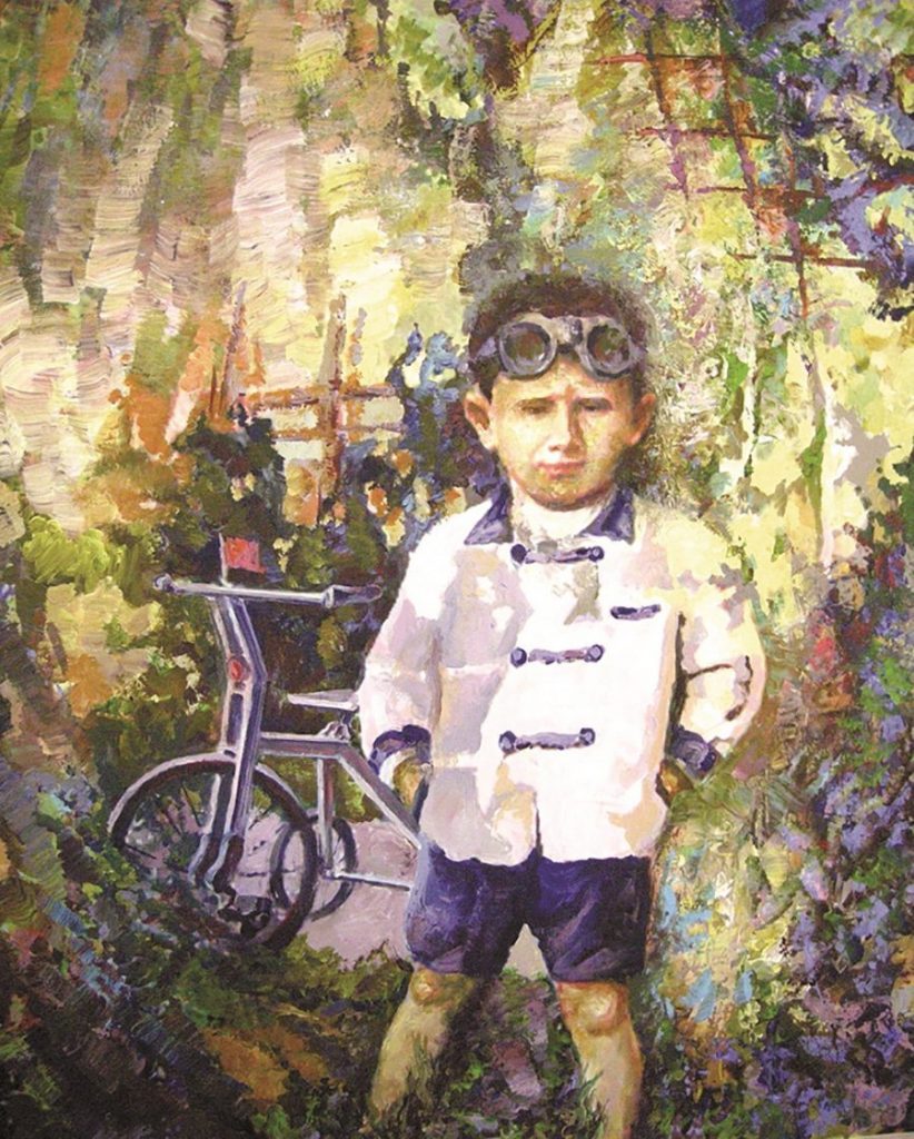 Светлыя, шматколерныя згадкі-пачуцці пра дзяцінства ў пасляваенным Брэсце ён увасобіў у карціне, якой адкрываецца выстава. Вакол хлопчыка з трохколавым роварчыкам за спінай быццам сонца разлілося, вясёлкамі рассыпаліся праменьчыкі. Гэткі вобраз шчасця безумоўнага, безагляднага – дзіцячага. З тым аўтапартрэтам з 50-х перагукваецца па каларыстыцы й “Лара. Партрэт жонкі”, аднак у ім яшчэ больш чароўнай, стракатай, бы пялёсткі кветак, гульні фарбаў, і плаўныя лініі, дзівосныя ўзоры-карункі больш вытанчаныя. Тэматычна звязана з Брэстам і карціна “Брэсцкая мадонна –1942. Памяці Халакоста”: праз пакутніцкі вобраз яўрэйскай дзяўчыны, змрочныя фарбы перадаецца боль, трагедыя ваенных гадоў.