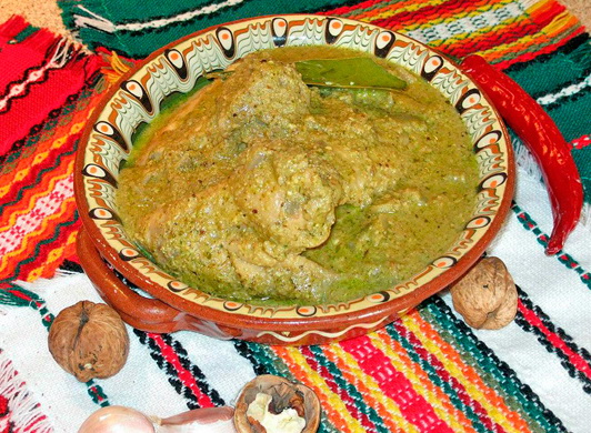 Спатрэбіцца: 1 курыца (каля 1,5 кг), курыны булён, 500 г ачышчаных грэцкіх арэхаў, 2 ч. лыжкі сушанай каляндры, 1/2 ч.лыжкі шафрану; 1 ч. лыжка молатага чырвонага перцу, 3 зубчыкі часнаку, 1 рэпчатая цыбуля, 3 яечныя жаўткі, 1/2 ст. лыжкі віннага воцату, соль, молатая карыца, гваздзіка — на смак.
